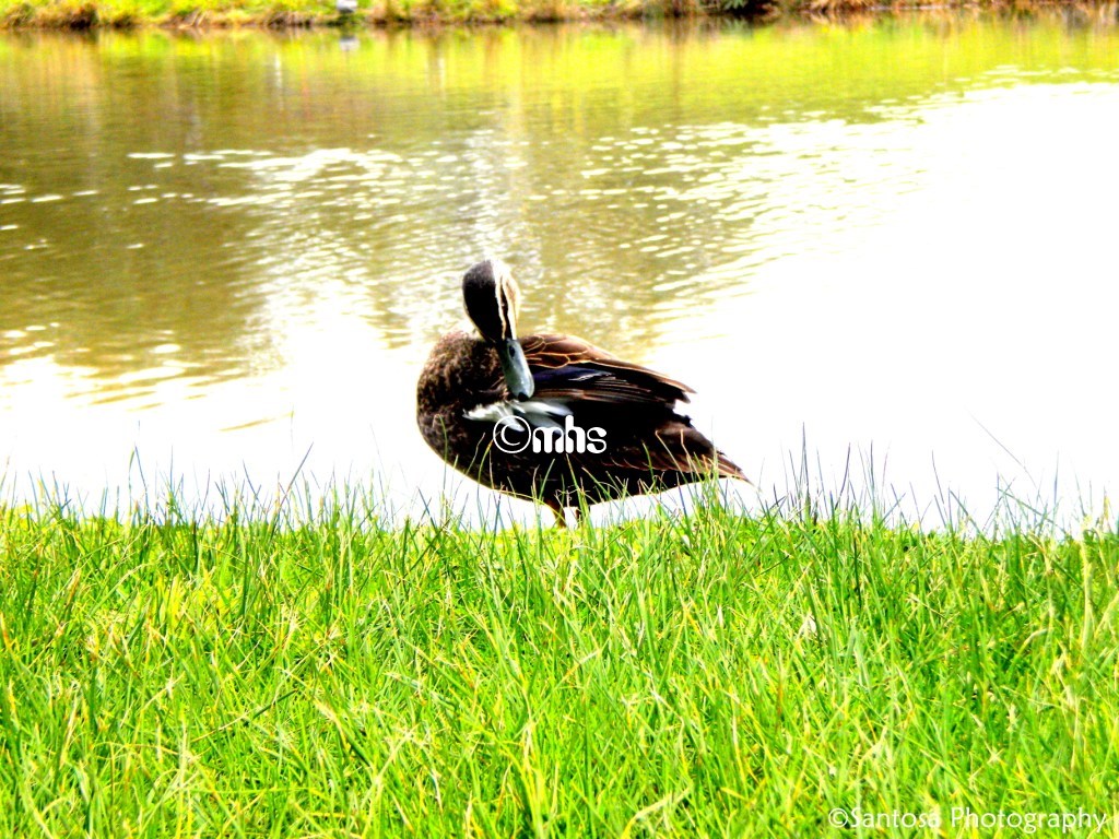 Bebek coklat kehijauan masih tetap berenang di dingin musim kali sekarang,