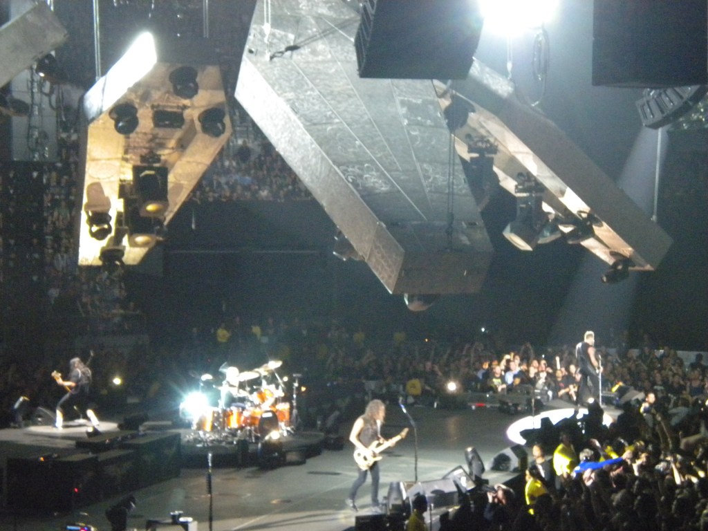 Sesampainya di gate 9, akupun bersiap masuk. Di pintu 3 ini, aku hanya perlu menunjukkan tiketku sekali lagi untuk kemudian dibantu mencari tempat dudukku. Aku takjub melihat tatanan panggung konser kali ini. Sangat berbeda dari konser band-band lain yang aku pernah tonton. Panggung tidak ditata dengan ‘konvensional’ dimana penonton melihat band beraksi di depan mereka dan sound system tidak disisi kanan dan kiri, drum tidak di tengah. Panggung Metallica ini ditata sedemikian rupa, dimana penonton dari berbagai sudut bisa melihat mereka. James Hetfield (vokal & rhythm guitar), Kirk Hammet (lead guitar), dan Robert Trujillo (bass) dengan aktif berpindah-pindah posisi untuk menyapa penonton di dekat mereka sedangkan Lars Ulrich (drum), dengan setingan tersendiri yang bisa diputar pada bagian waktu tertentu. Sound system ‘digantung’ diatas dengan lampu-lampu sorot yang memukau. Kualitas lampu dan suara yang dihasilkan benar-benar mantap di telinga. Tata lampu mulai dari laser dan lampu sorot yang cerah berwarna-warni bergantian siap menyorot panggung.