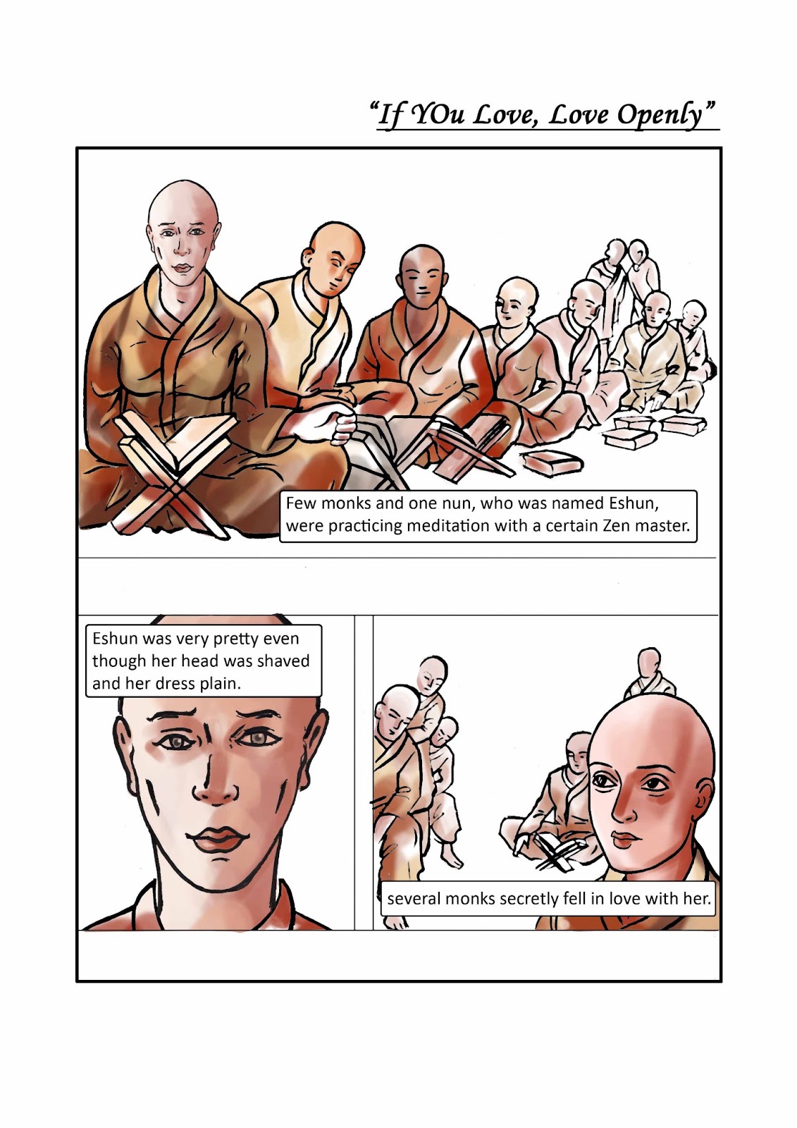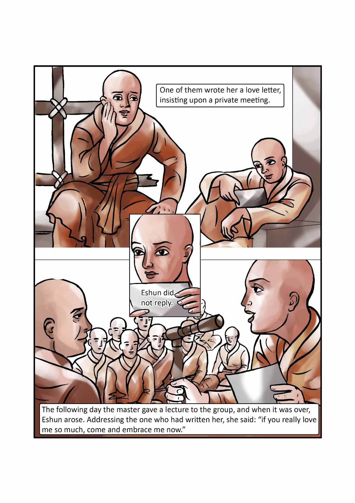 Eshun was very pretty even though her head was shaved and her dress plain. Several monks secretly fell in love with her. One of them wrote her a love letter, insisting upon a private meeting.