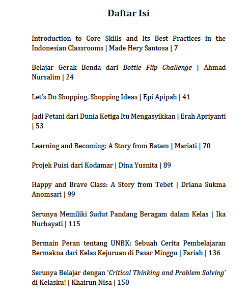 Buku ini berisi kisah-kisah para guru dari berbagai tempat di Indonesia yang menerapkan keterampilan-keterampilan abad 21 – disebut core skill – dalam kelas-kelas mereka. Buku ini sangat bermanfaat karena memberi contoh nyata praktik-praktik baik yang bisa dicobakan di kelas-kelas para guru secara lebih luas lagi. Semoga SDM Indonesia bisa lebih baik lagi, mampu berperan di dunia global tanpa lupa kearifan lokal. Jika tertarik, bisa menghubungi saya atau para penulis ya :)