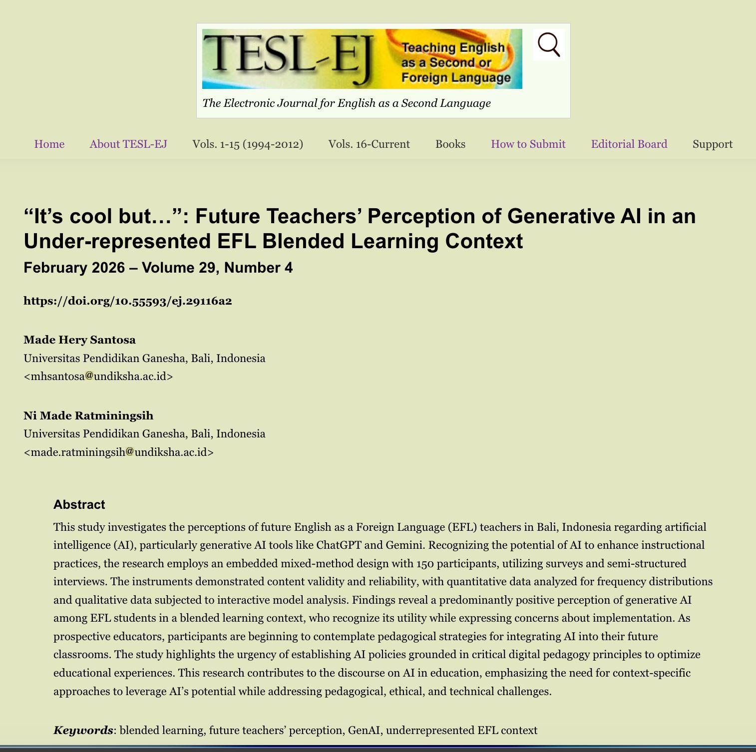 We are glad to share our newly published article in TESL EJ. Thanks all, thank you Ibu Prof Made Ratminingsih.