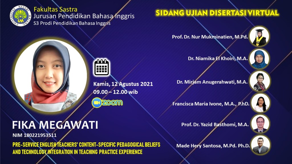 - Fika Megawati, Pre-Service English Teachers’ Content-Specific Pedagogical Beliefs And Technology Integration In Teaching Practice Experience, Universitas Negeri Malang (2020)