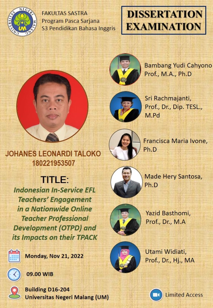 - Johanes Leonardi Taloko, Indonesian In-Service EFL Teachers’ Engagement in a Nationwide Online Teacher Professional Development (OTPD) and its Impacts on their TPACK, Universitas Negeri Malang (2022)
