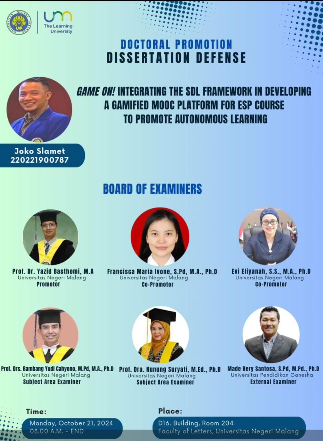 - Joko Slamet, “Game On! Integrating The SDL Framework in Developing a Gamified Mooc Platform for ESP Course to Promote Autonomous Learning” (2024)